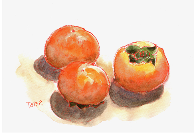 あちこちの家の庭によく熟した色のたくさんの柿が